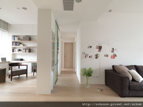 這是在台北市天母的一處新屋,整體空間的設計概念,以穿透及留白為主軸,企圖讓居住者的人味與生活感被強化出來。例如,書房與餐廳之間的摺疊拉門,使用清玻璃及極細的黑鐵烤漆當框,轉折處的柱體也有收納的功能。另外,客廳的電視主牆雖然沒有用到大量的木做或石材拼貼,但用藍灰與綠灰乳膠漆營造沉靜自然的感覺,效果奇佳。餐廳及書房都使用整片竹片百葉從天花板降到櫃面,是禾築設計師在施工現場觀察到陽光的走向後,決定使用的元素,「坐在餐廳時,可以看到映在桌面及地板上的光影線條、隨著時間而遊走。」全室鋪上栓木染白、並將原本建商提供的暗色門框及房間門都換成同一個材質,在視覺上走道顯得更休閒輕鬆。
