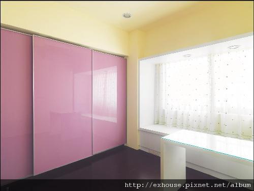 塗鴉、收納兩相宜的衣櫃。小孩房的衣櫃設計成三等份的隔間,中間並且預留可以收納書桌的空間,門片選擇玻璃的材質,讓孩子有一個可以盡情發揮童心塗鴉畫畫的地方。