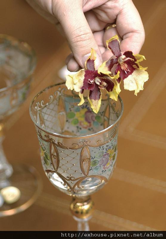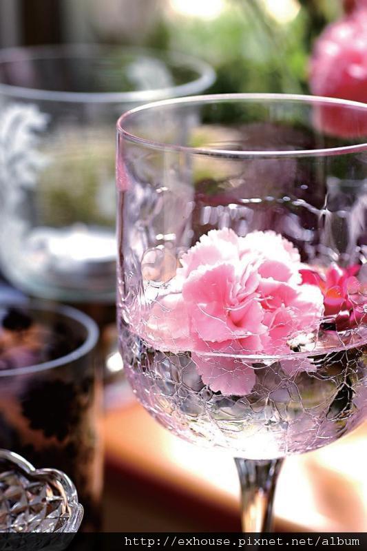 從花市買幾朵當季的鮮花,或是從朋友家中剪幾朵尚未盛開的花朵,放入加水的酒杯,讓酒杯瞬間成為簡約的花瓶。花朵較大者如玫瑰,杯子加水至一半後整朵放入即可。花朵較小者,枝枒剪至杯深的1.5~2倍之間,高矮穿插最為好看。