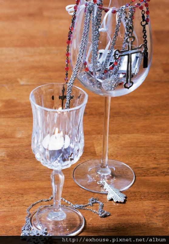 把不同的顏色的項鍊、墜子、耳環放入杯中,在穿戴之際,可輕鬆拿取;放在客廳的茶几上,也不覺得突兀,像是裝飾品一般的飾品盒。同時,可在旁放置另一只小酒杯,放入圓形小蠟燭,時尚酒杯燭臺儼然而生。