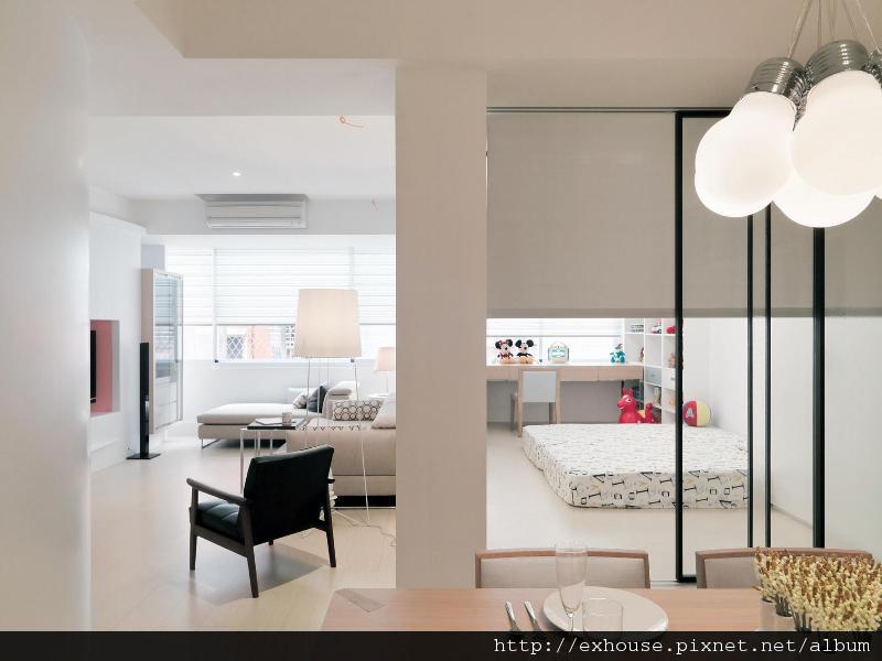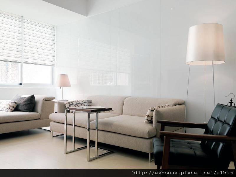家裡有小朋友的人都知道,白色牆壁上最怕髒,也最容易出現被手亂摸的污漬,為了解決這個煩惱,設計師利用白色烤漆玻璃,作為沙發背牆的材質,如此一來就不用擔心小朋友觸摸,且清理起來也輕鬆簡單。