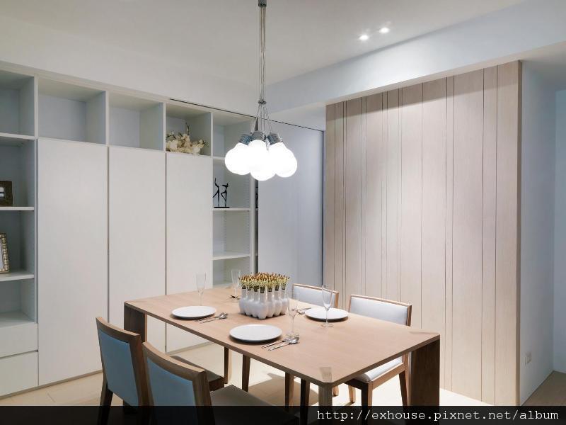 餐櫃常會因為放置電器,破壞空間的整體性,於是設計師運用隱藏設計手法,藉由拉門和門片遮掩電器設備,降低視覺上的雜亂感的同時,也維持了空間的完整與一致性。