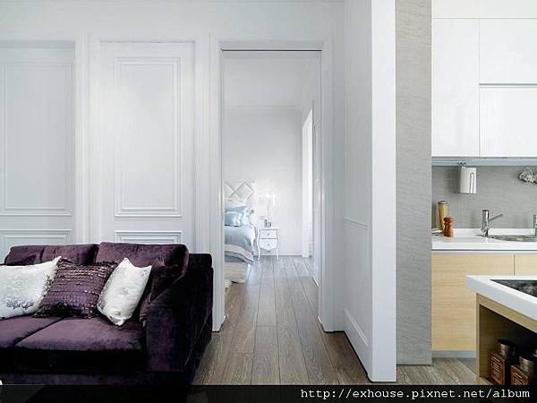 重點2 白色營造簡潔、乾淨的氣息白色在小坪數裡有放大的效果,同時,也具有簡潔的感覺,整個空間即以白色為主調,帶出法式古典氣息,因此,特別額外訂製白色的大門以統一空間色調,佐以橡木地板表現溫暖的感覺,臥室整面牆大的衣櫥也以自然的木紋調和,讓空間的感覺雖然簡潔、乾淨,但不冰冷,而是溫馨。