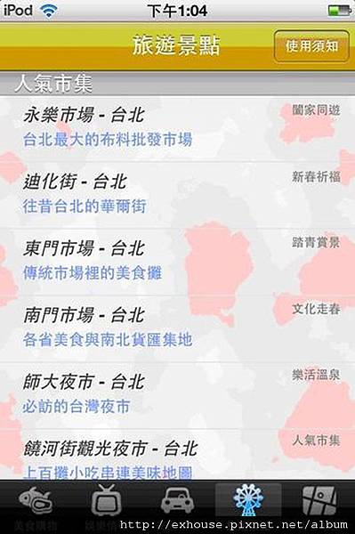精選的旅遊景點內容則包含了景點介紹與基本資料如:地址、電話、網址、營業時間與價格等,並以明顯的版面編排,特別強調春節營業時間、春節活動等最新資訊。iPhone使用者可透過手機直接點選電話號碼撥打電話;也可以點選網址開啟網頁瀏覽器進入各景點網站。