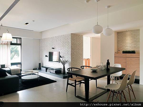 空間內除了白色的基底外,揉合材質呈現自然質樸的美感,藉由帶有紋路的木皮、噴砂面石材、復古文化石、黑色鐵件,以細膩的姿態讓空間回歸自然原始風味,而色調也更顯溫馨暖和。夜裡客廳立燈的黃暈燈光映照在電視牆的白色文化石上,巧妙地為居住者由喧囂塵上的都會叢林,隱身轉入一處屬於自己原始天真的世界中。
