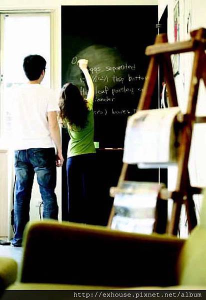 餐廳一隅設置黑板牆提供塗鴉增添牆面表情變化。裝修遺留的木梯拿來當書報架,小巧思更彰顯了獨特品味。