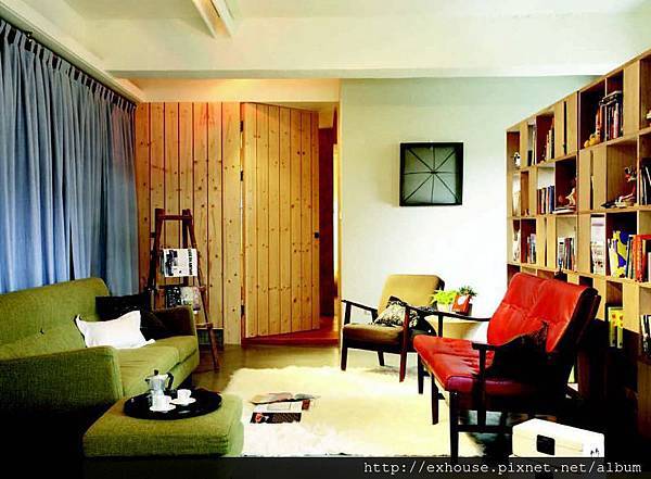 主臥與衛浴外牆用美國雲杉鋪陳休閒,水藍窗簾結合秋香綠、橘紅和駝色座椅做搭配,使空間更加洋溢自然氣息。