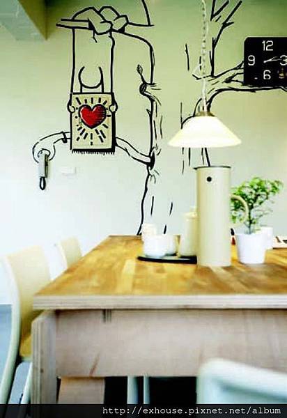 餐桌是設計師用廢料拼接組裝而成,不均勻木色吻合空間傳達的自在調性,也與一旁的壁貼共鳴生活小趣味。
