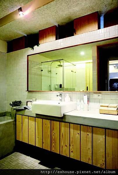 浴室牆面與工作陽台銜接,為增加採光與通風留下一列空隙,但用16 個L 型層架來調度開闔,同時增添造型感。