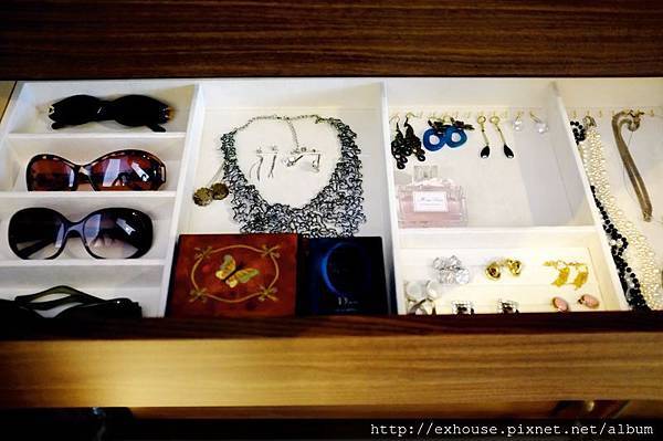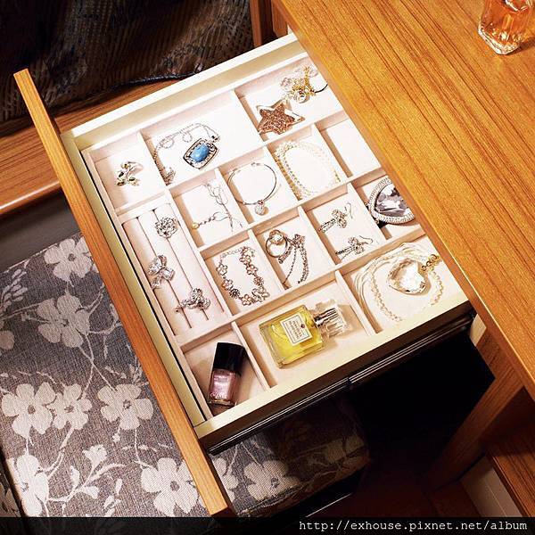 配件因為數量多、大小規格不一,一般人在沒有工具輔助的情況下,要能分門別類、保持整齊是一件很困難的事。領帶、絲巾、飾品在系統傢俱中,都有專屬的收納架,還有一、二十種五金可視情況選配,櫃內的梳妝抽內、也有各式小五金能搭配,或分格擺放化妝品。