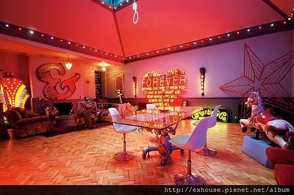 3 年多前,Philip 和Olivia 搬進這個位於英國蘇塞克斯的廢棄酒吧,兩人花了1年半的時間將超過百坪大的老酒吧重新打理,地下室規劃為私人工作室,一、二樓空間變身為承襲自己興趣和職業的居住複合場所,加入了許多新奇好玩的裝飾元素為兩人增添生活樂趣,就因為Philip 對燈彩的著迷,將家中融入了各式商業廣告的造型燈具,把屋子打造成一個巨大的發光體,四處可見奇型怪狀的巨型十字架、巨型愛心、飛躍鳥群、裝飾招牌和一閃一閃的發光燈泡填充在空間的每個角落,發散著紅、黃、藍、紫炫爛且魅惑的霓虹光暈,眼花撩亂又令人目眩神迷。