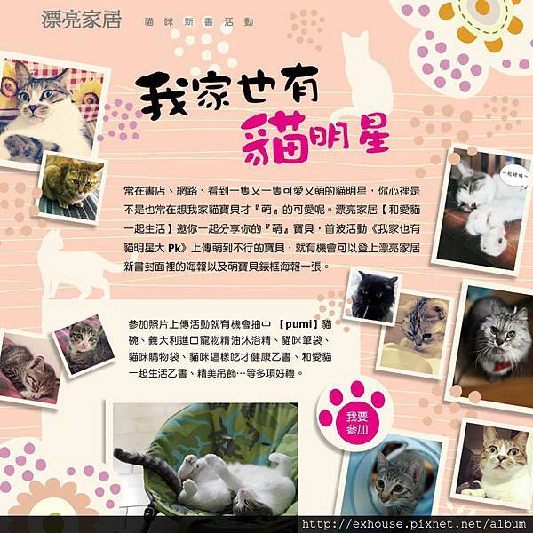 上傳萌到不行的寶貝,就有機會可以登上漂亮家居新書封面裡的海報以及萌寶貝錶框海報一張。4月24日-和愛貓一起生活 快來找尋你的愛貓