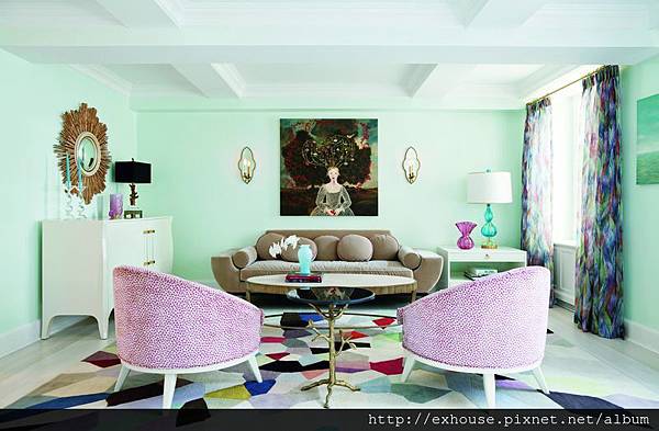 舊公寓的光線不算充足,因此設計師以淺色系和亮面傢具提升明亮度,客廳以屋主最喜歡的藍綠色和桃粉色作為配色主題,藝術化的傢具元件增添空間趣味。