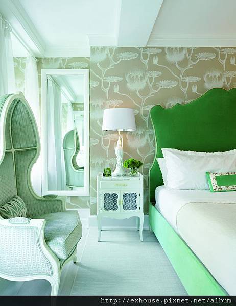 主臥空間以樹木圖案壁紙和草綠色床頭營造清新的自然情境,別出心裁地在床頭搭配了栩栩如生的鸚鵡造型桌燈,使整體流露輕鬆自然的寢居氛圍。