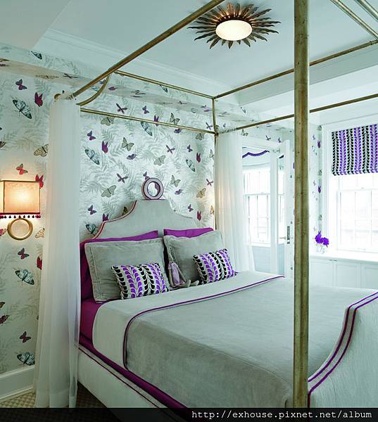 最後來到小女生的天地,不意外是甜美的粉色調,但最讓人興奮的是布滿翩翩飛舞蝴蝶的壁紙,搭配金色床柱以及白色床紗,完全就是所有小女生夢寐以求的公主風格。