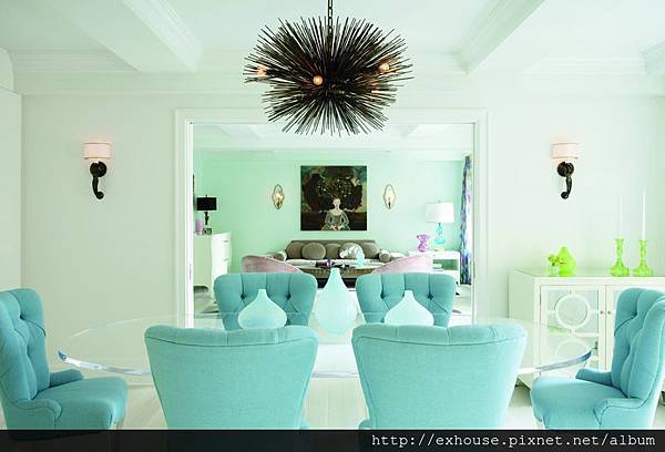 設計師Fawn Galli表示,由於公寓的光照並不是那麼充足,因此利用白色和亮面傢具來平衡,再以屋主最喜歡的藍綠色和桃粉色作為整體空間的主要基調,並大幅度使用圖案壁紙來營造空間情境。入口玄關就以米色的樹林圖樣壁紙為開端,引領屋主正式進入森林奇幻世界,淺綠色調的客廳簡單配置一字型沙發和2張單人椅,靜靜放置在繽紛色塊地毯上,配飾除了仍以藍綠和桃粉色系穿插搭配,其他像是邊桌、掛鏡及羚羊擺飾等則適度以金色點綴,讓空間質感更顯夢幻華麗;客廳另一側的餐廚房,運用大面積的白色搭配高明度的藍綠色餐椅與透明餐桌,創造無比的輕盈量感。
