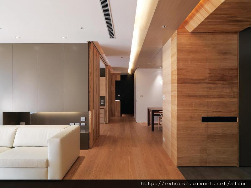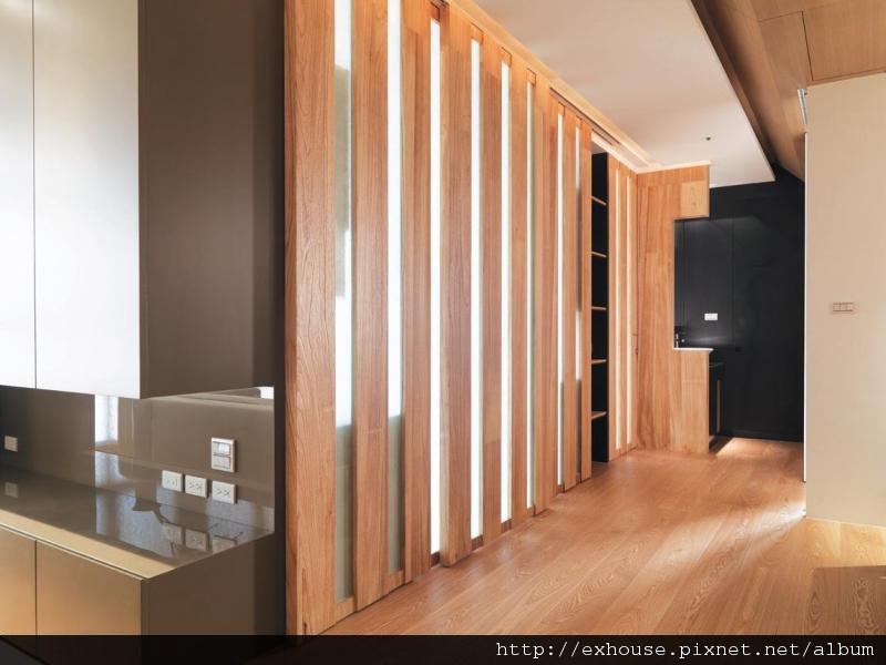 此案的木作天花全為直紋橡木,立面則幾乎全用肌理鮮明的風化木來表現。風化木立面從玄關入口、書房拉門,一路引導到進入主臥的轉角牆面(洗手檯外牆);至於白色與橡木木作天花所形成的燈帶,亦從客廳沿著通道深入室內。