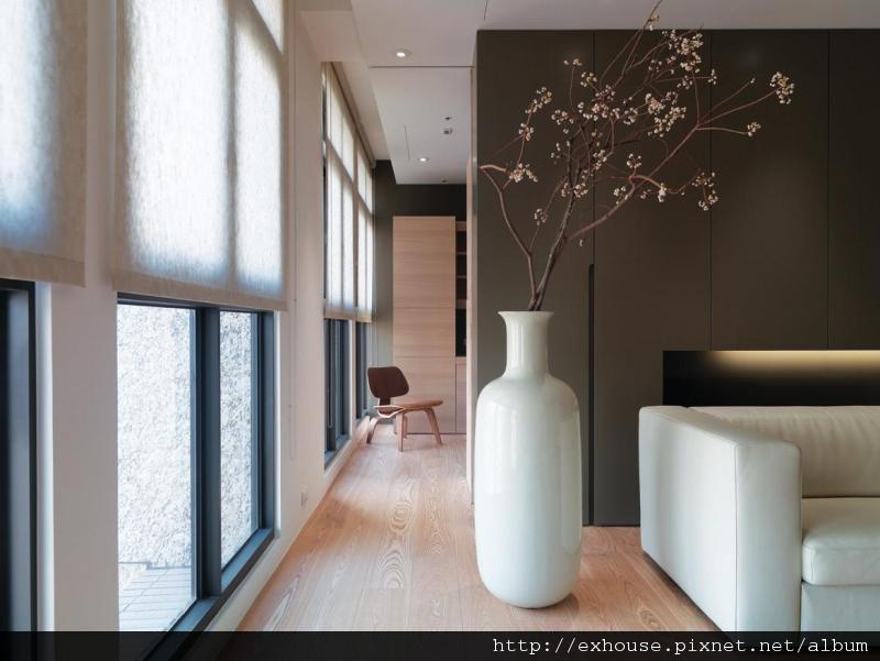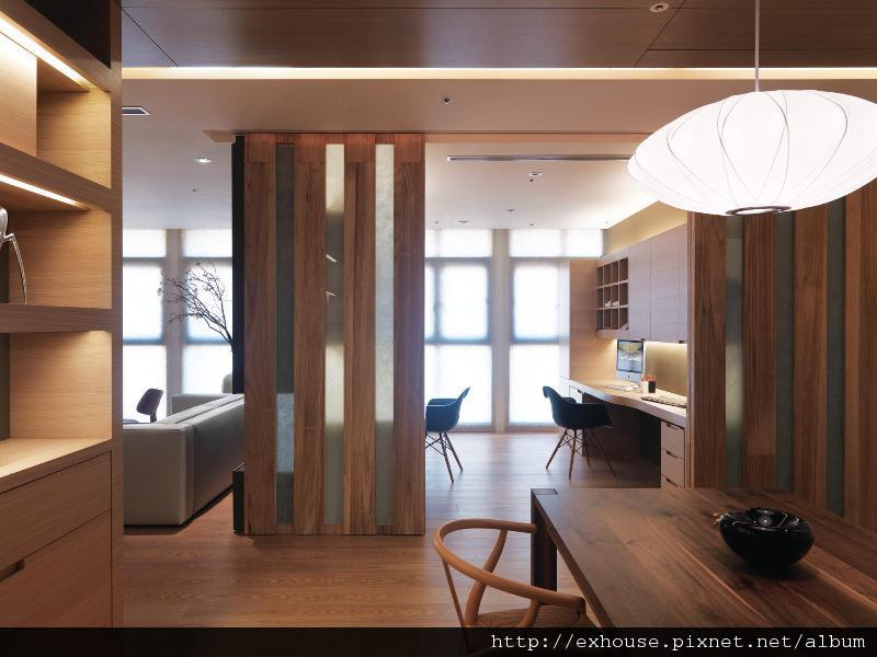 書房的柵狀拉門,不透光的風化木與半透光的棉紙玻璃,構成了強烈線性的塊面;而客廳的家具組則充滿了對比的旨趣:造型方正的皮革沙發、Eames夫婦經典之作的L公分曲木椅,以及原木小茶几,造型語彙與材質特性各自迥異,卻又巧妙地達成和諧。