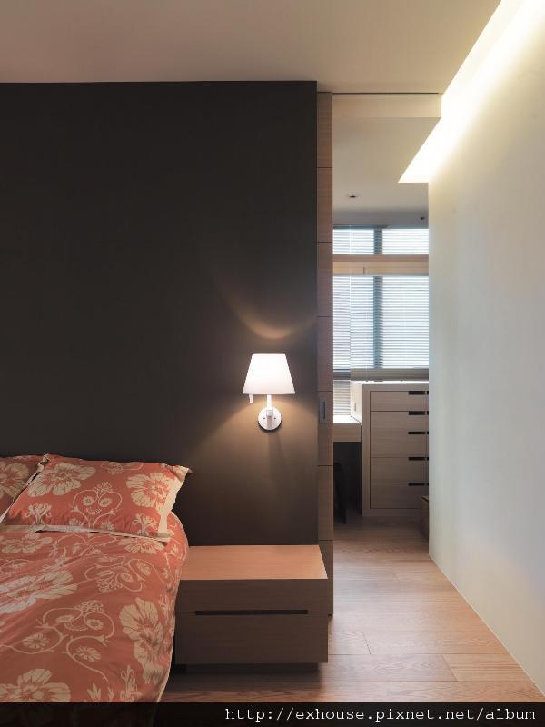 臥房僅運用原木與烤漆這兩種材質來呈現簡潔面貌,以回歸寢室應有的休憩功能。床頭的木作背牆亦未做任何繃布等處理,僅以烤漆表現單純的塊面,並沿用玄關側牆與客廳背牆的「海松茶」色。床尾面對的則是整排貼覆原木木皮的木作櫃牆。