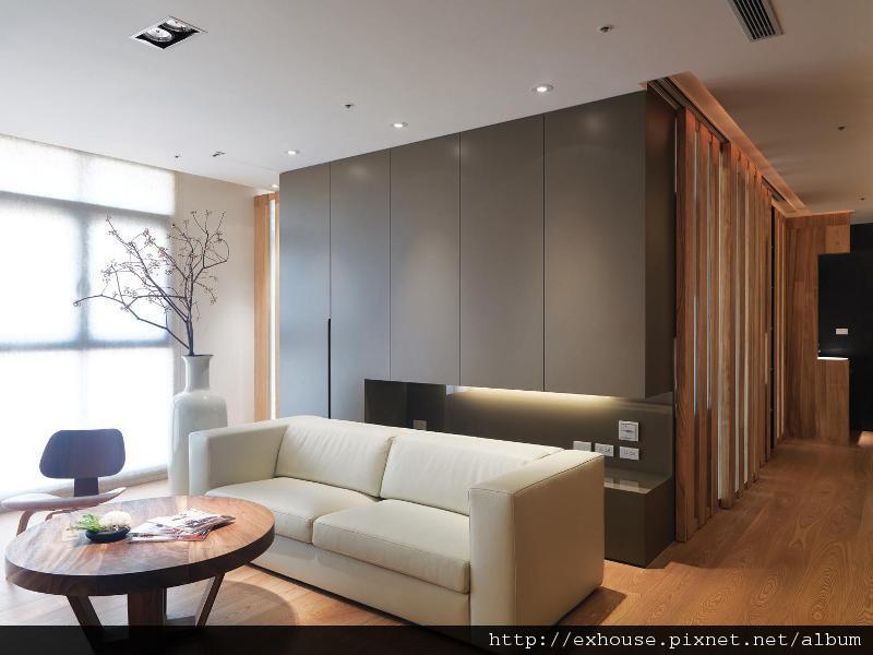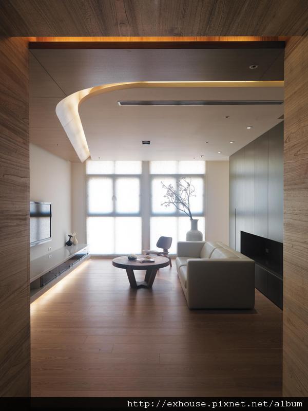 日式禪風的空間,帶有大量的木作與90°直角。米白色的木作天花及電視主牆,舒緩了滿是原木的飽和感。白色與橡木的造型天花,交界處打造出3D立體的弧狀溝槽;內藏了間接照明而形成一條燈帶。弧狀轉彎的燈帶,呼應客廳原木小几的圓形桌面。藉由天花的弧線及家具的圓,柔化了線性空間的生硬。