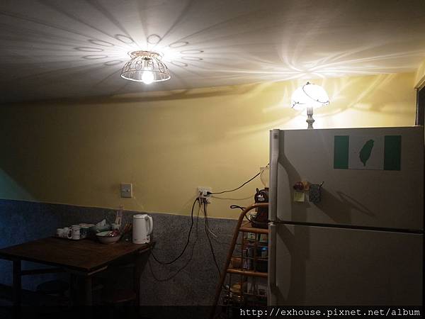 (透過復古老鐵籃改裝作為燈罩,在天花板映照出輻射狀的圖騰。)