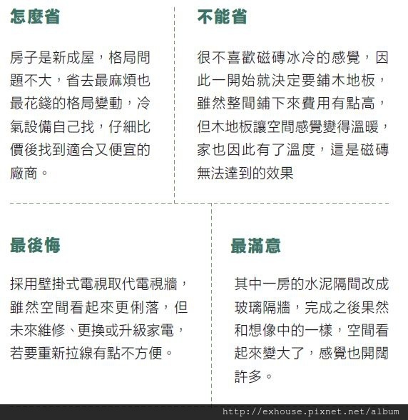 雖然購屋花了大部分的預算,但希望將制式的新成屋,注入我們喜歡的居家風格,也希望透過裝修可以住得更舒適,因此預留了一筆裝修費用。在預算有限的情況下,曾遇過因預算太少而不想接案的設計師,幸好最後找到了與我們合拍的裏心設計,在設計師的幫忙下,不只控制在預算內,也完成了期待中簡約卻又不失溫馨的無印居家。