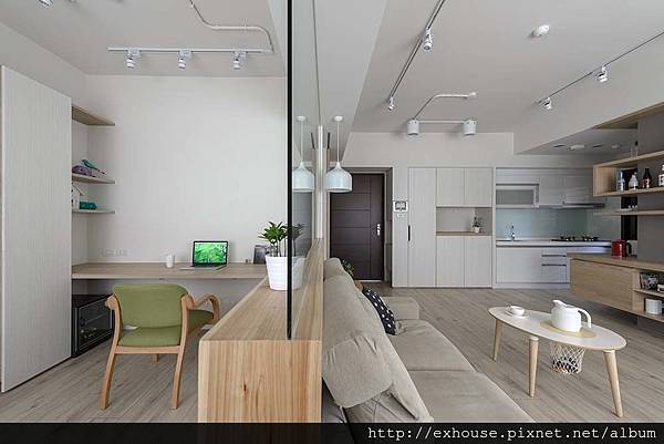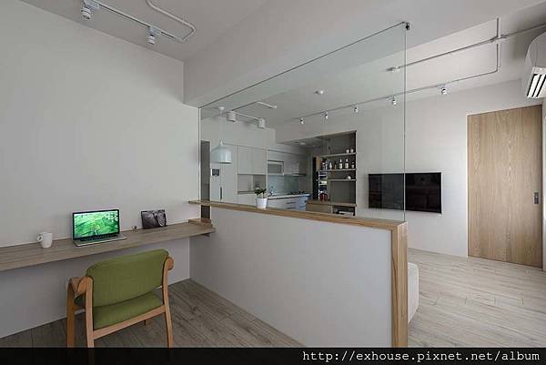 一般新成屋格局問題通常不大,但水泥隔牆卻是讓小空間感到狹隘的最大主因,仔細討論過後,屋主郭先生同意將比較不需要隱私的書房隔牆拆除,改以清透的玻璃做隔間,而因隔牆受到阻礙的視線就此豁然開朗,玻璃的穿透效果更成功延伸空間。