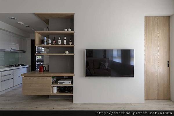 05 活動傢具取代實木桌,裝修不用一次做到位在房門原始位置,以木作打造一面木質收納牆,利用少量開放式收納,裝飾、豐富生活空間,而原本從木質平台延伸的實木餐桌設計,考量價格過高,未來屋主可自行購買現成餐桌取代。