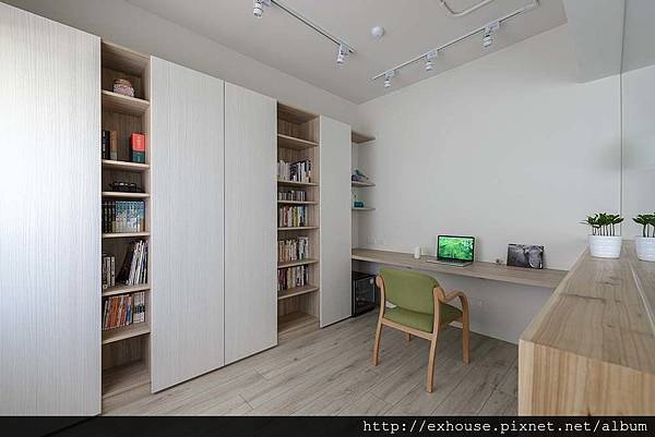 07 改用系統層板,因應空間變動性考量未來書房需更改為兒童房的變動性,將實木書桌設計,改成從系統收納櫃延伸出層板作為書桌使用,符合屋主需求,未來拆除也很容易,而且以系統層板取代實木,費用上也便宜許多。