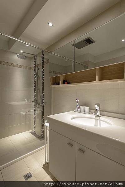 08 材質換新,快速提升質感保留原始衛浴設備,只將看起來廉價的塑價天花板換成矽酸鈣板,質感瞬間提升。另外新增造型簡潔的鏡櫃,增添收納也呼應整體空間的俐落風格。